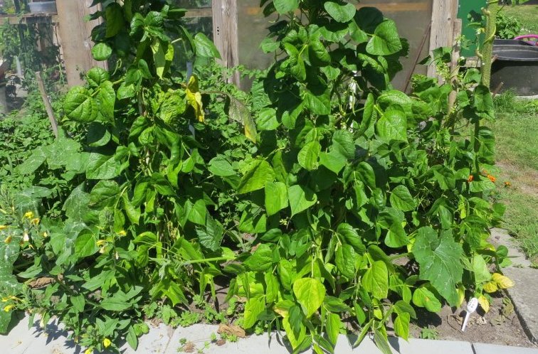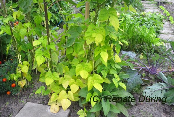 Ich habe sie wieder an hohe Sonnenblumen gepflanzt. Die Blätter der Sonnenblume, wie auch deren seitlichen Blütentriebe habe ich bis zur Höhe der Bohne entfernt. Das war ausreichend, um der Bohne genug Licht zu geben.