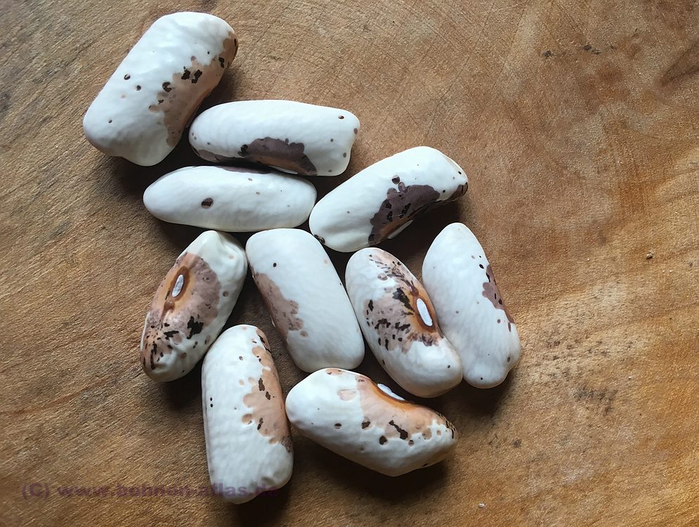 Der Samenmantel dieser Bohne hat eine ähnliche Färbung und Musterung wie Canau eine andere aus der Sammlung von Robert Lobitz