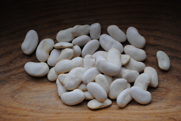 Hülse 15 cm lang und 0,15 cm breit, leicht gebogen, grün. 4 Körner pro Hülse. Korn elleiptisch/oval bis nierenförmig, einfarbig cremefarben, 14 mm lang und 7 mm breit.
