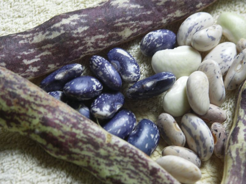 Wüchsige Pflanze. Gelb-grün-violett gestreifte fadenlose Fisolen. Grundfarbe der Samen beige, Deckfarbe graubraunblau genetzt.