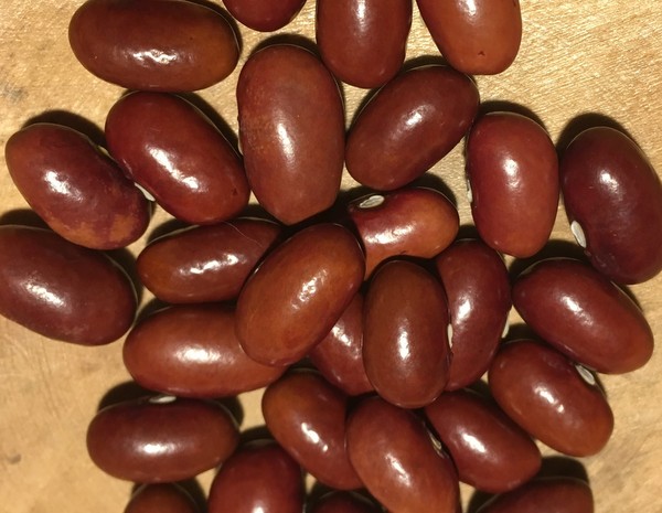 Urtümlich wirkendes, ovales, teils kantig-tonnenförmiges Korn (15 x 7 mm) von matter, weinroter Farbe, die einen blauen Stich aufweist. Hohes Korngewicht. Interessante Farbstellung. Wohl reine Körnerbohne für typische Bohnen-Eintöpfe und Beigabe zu Salaten.