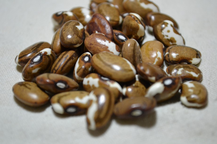 "Interesting gray/brown on white color with Jacob's Cattle/Ojo de Cabra patterning, the darker color displaying "ojo" stripes and speckles. High-yielding pole bean, collected in Maycoba, Sonora."