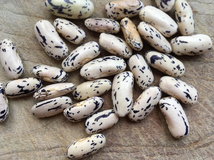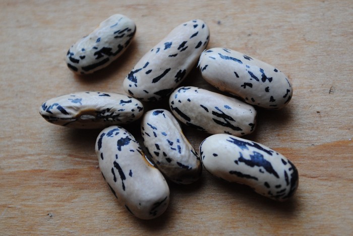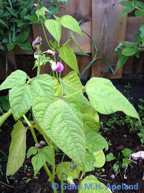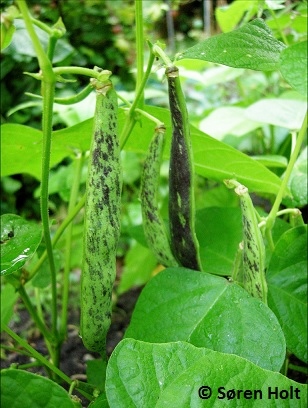Hülsenlänge 10-4 cm, grün mit dunkellila/roten Streifen. Die trockenen, länglichen Kerne sind leicht zu ernten.