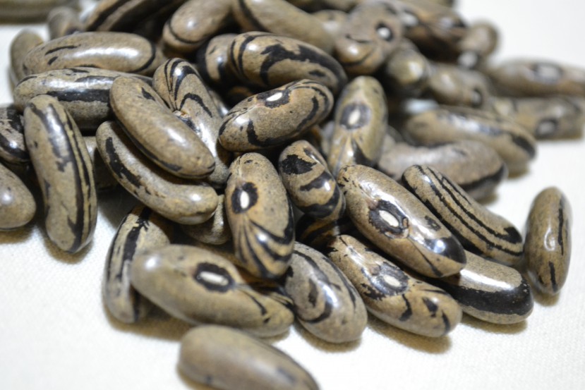 "Snap bean. Long, very round green beans have good texture but are slightly astringent; crunchy; somewhat dry. Late to develop a suture string. Pods are recurving, or slightly S-shaped. Pods mature to yellow and develop light purple mottling. Strongly climbing pole bean. Pods measure 7-9" long. Leathery podded dry pods. 6-9 seeds per pod. Unusual dry beans are speckled with light grey and have black stripes. They are long, thicker than they are wide, and kidney-shaped. Purple flowers. Non-pigmented plants. Hard-seeded. Intermediate productivity when grown in 2015 at Heritage Farm. Mid-season maturing. Donated to SSE in 2013 by Evalynn Schnackenberg of Washington. Evalynn’s grandmother, Maria Andreasen, moved to Washington state from Minnesota in the early 1900s with her 11 children after her husband’s death. At some point around 1920, Maria obtained some bean seeds from the county extension office in Ferndale, WA. She planted them, enjoyed them, and saved the seed to plant in following years. Several of Maria's children and grandchildren have also grown the beans in the years since. SSE Accession # 131789."