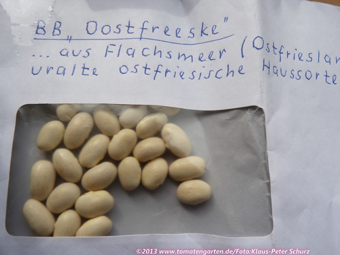 Grünhülsige Sorte aus Flachsmeer (Ostfreisland). Wohl eine uralte ostfriesische Haussorte. Die dicklichen weißen Samen messen etwa 13 x 7 mm.