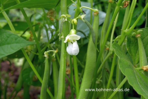Buschbohne, 50 cm, Blüte weiß, grüne Hülse, grünliches Korn, Verwendung Grünbohne, reich tragend.