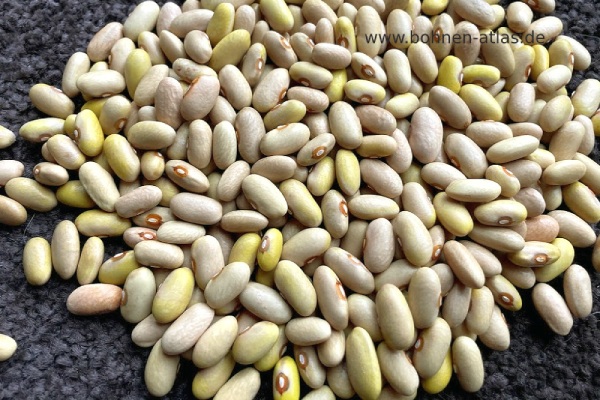 Weiße bis zartrosa Blüten, Pflanzenvitalität und Ertrag eher durchscnittlich. Nutzung als grüne Bohne/Fisole: Schnippelbohne, sehr fädig, bohniges und nussiges Aroma, jung geerntet sehr aromatisch nussig. Getrocknete Körner eher festkochend, Aroma: nussig, gekochte Kartoffeln, gut geeignet für Eintöpfe mit Tomate/Chili. Gerade bis sehr gering gekümmte, grüne Hülse mit rundem Querschnitt, glatte Oberfläche. Länge 15,5 cm, Breite 1,2 mm. 6 Samen pro Hülse. Spitzes Hülsenende. Körner länglich mit fast rundem Querschnitt, geradem Bauch und konvexem Rücken mit Bug. Frische Körner uni gelb/grün, getrocknete braun. Große Körner: 100 g wiegen über 40 g.