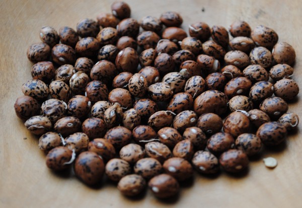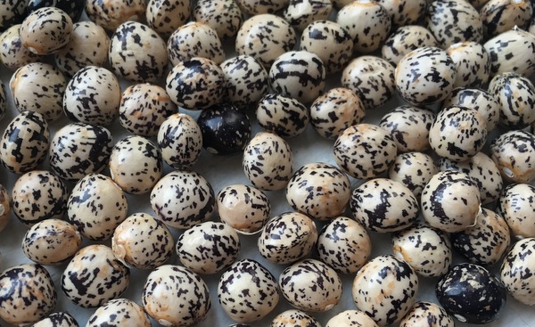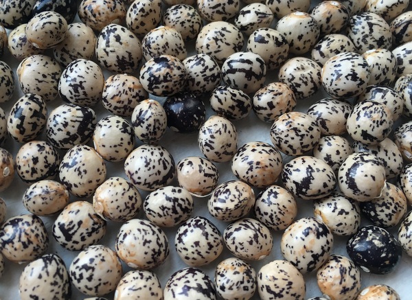 Feststellung kurz nach der Ernste ist die Bohne fast weiß in der Grundfarbe und Dunkel gesprenkelt. Hier Dunkelt die Bohne erst im laufe der Zeit nach! Bilder Folgen.