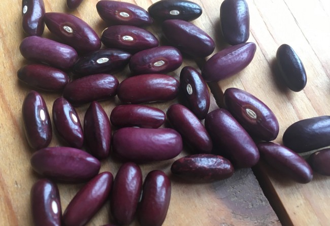 Produktive Buschbohne mit kräftigen, aufrecht wachsenden Pflanzen. Blätter an den Nerven dunkelgrün, Blüten rosa. Lange, hügelige, fleischige Hülsen, Gänzend schwarze Kerne.