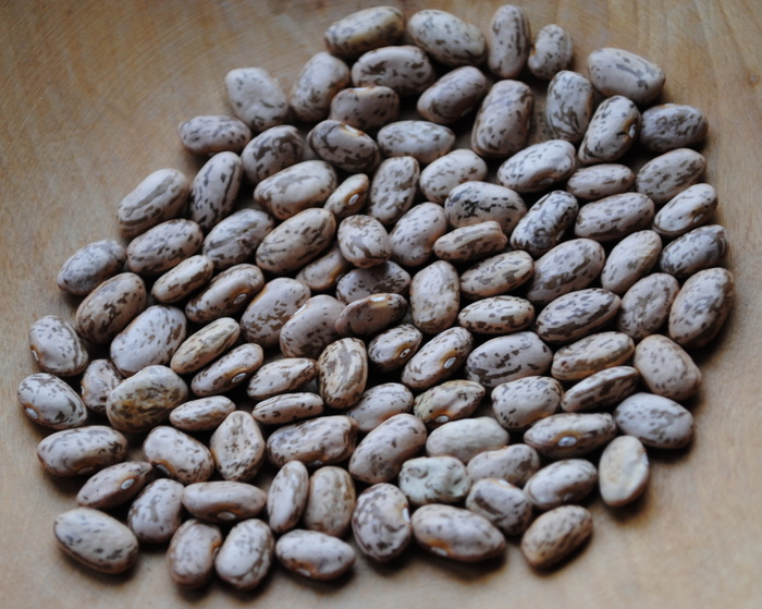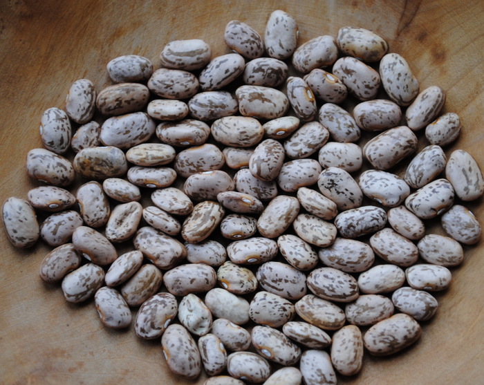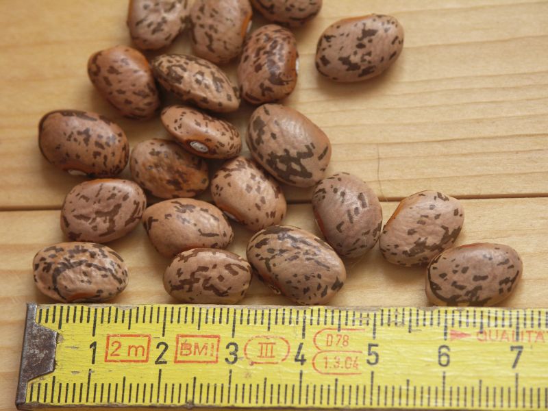 Diese Körner-Wachtelbohne aus Nordmexiko hat eine helle cremebraune Grundfarbe mit leichter bräunlicher Sprenkelung. Die Samen messen 13 x 5 mm und sind etwas dicklicher als 'Bewis Pinto' - ansonsten ähnlich.