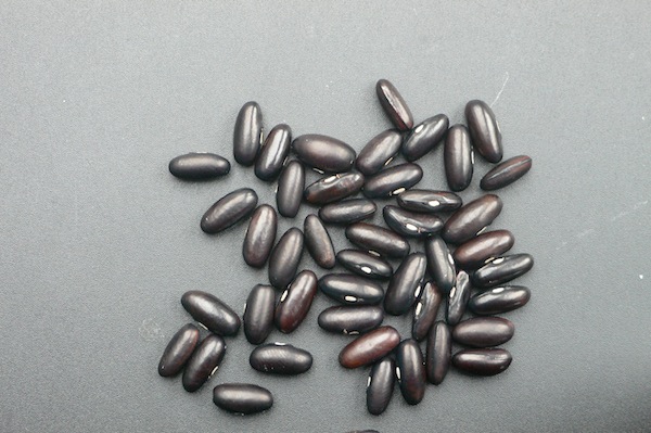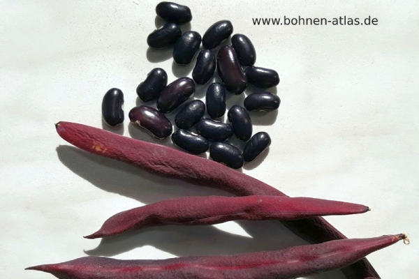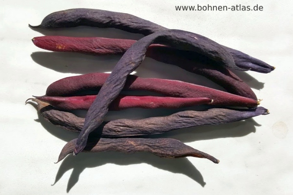 Gerade/gering gekrümmte, einfarbig grüne Hülse mit leicht lila Haaaren, eiförmig/elliptischer Querschnitt. Hülsenlänge 8 cm, -breite 0,6 cm, 5 Samen pro Hülse. rockenhülse mit starken Einschnürungen. Leicht abgestumpftes Hülsenende. Längliche Kerne mit ovalem Querschnitt, Bauch gerade, Rücken konvex, einfarbig blau-violett, länger getrocknet schwarz, klein (100 St. wiegen 12 g).