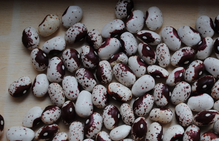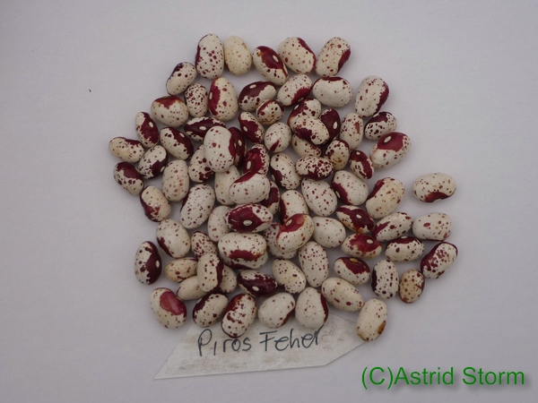 Hübsche ungarische Sorte, Kerne sind weiß mit großem weinroten Fleck um den Nabel und weinroten sprenkeln, sehr ertragreich, sehr lecker