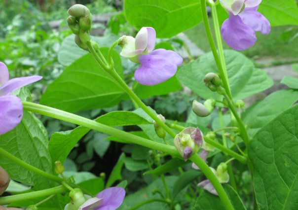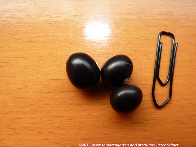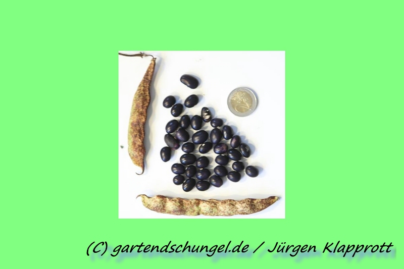 Hülse grün (einige gemustert), glatte bis etwas raue Oberfläche, gering gekrümmt, Bauchseite konkav, gelegentlich mit Taille. Länge 9-10 cm, Breite 1 cm. 4-5 Körner pro Hülse. Kurzer Zahn, zum Rücken aufwärts gekrümmt, stark eingedreht.