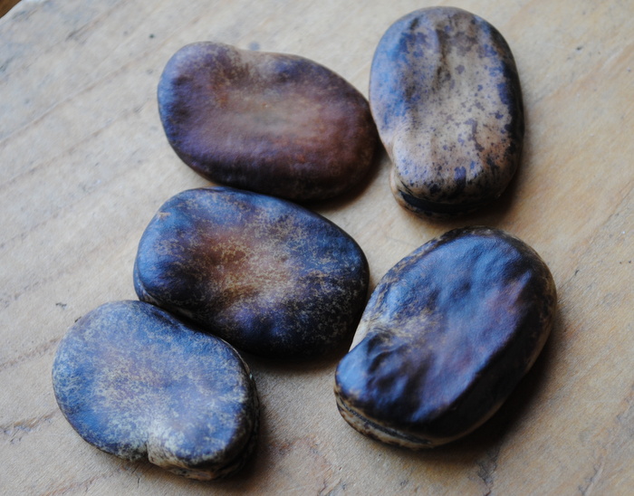 Eine wüchsige und sehr ertragreiche Puffbohne mit extrem großem Korn. Frisch geerntet ein helles grünes Korn, welches sich innerhalb weniger tage zu diesem schmutzigen Braun aussen hell, innen dunkel verfärbt.