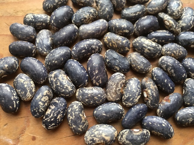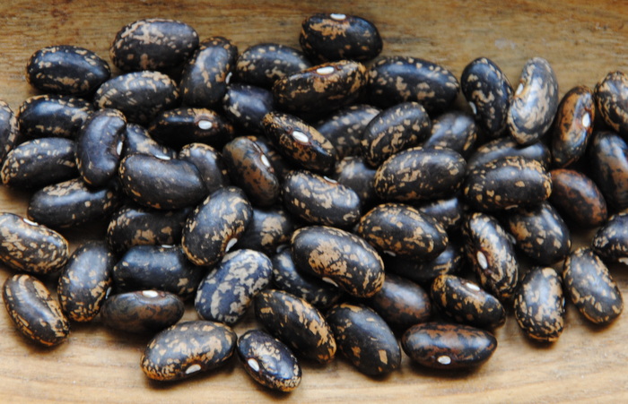 Fadenlose Stangenbohne mit violettstreifigen Hülsen. Samen dunkelgraubraun, unregelmäßig schwarz-violett gezeichnet. Nabel weiß.
