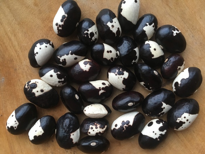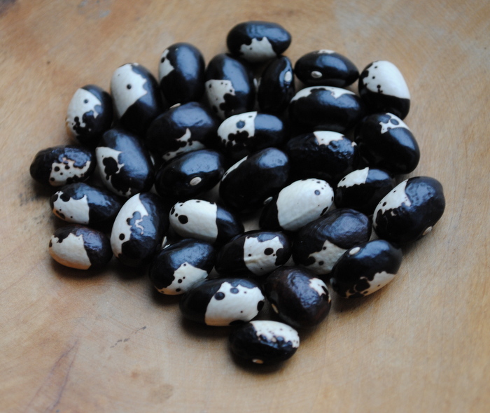dekoratives schwarzviolette- weiß gemustertes Korn. Die dunkle Zeichnung ist um den Nabel angesiedelt und nimmt 1/3 bis 1/2 der Fläche ein. Daneben haben einige Bohnen noch ein oder mehrere Punkte.