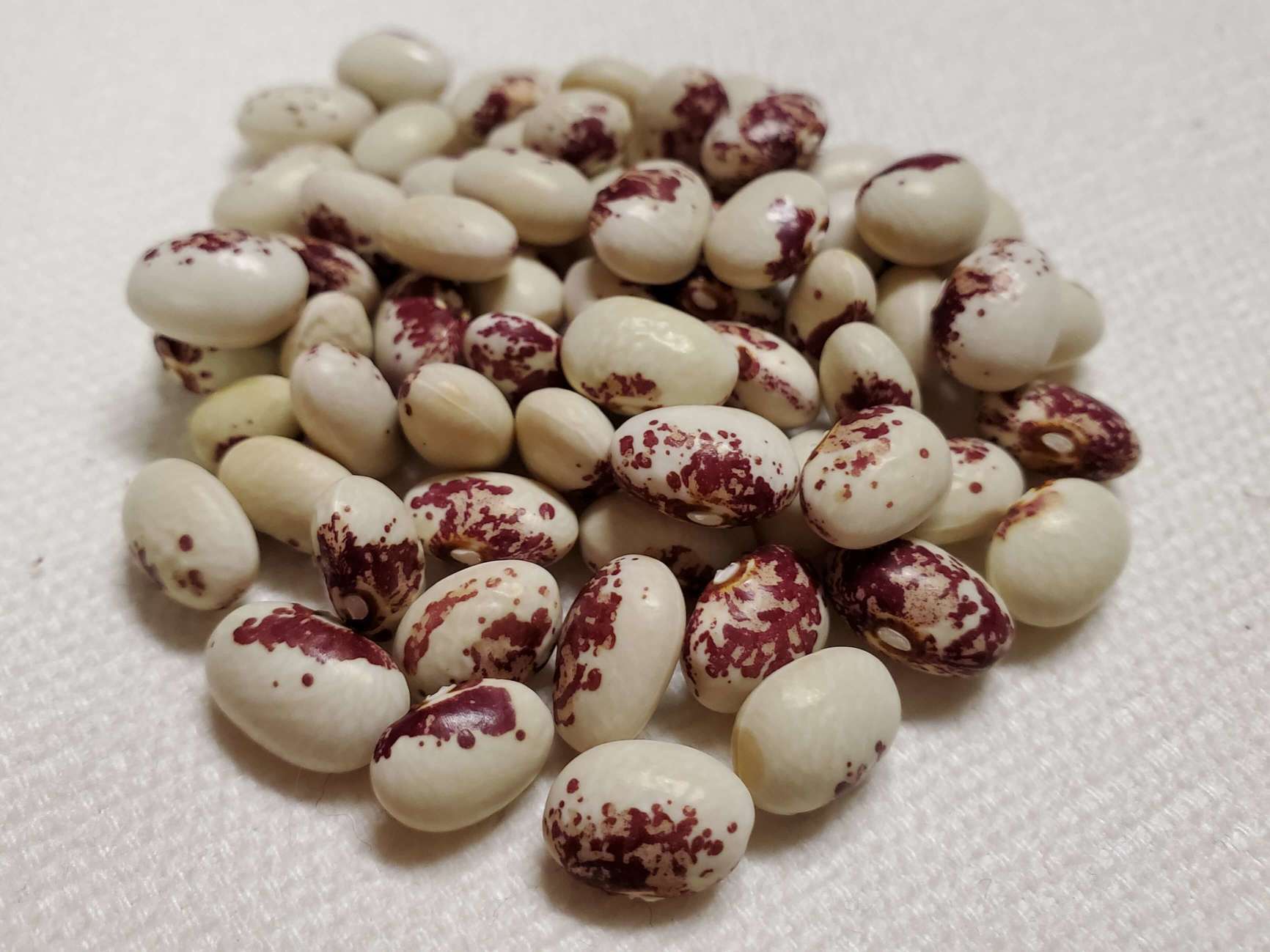 Gerade oder sehr gering gekrümmte Hülsen mit eiförmig/elliptischem Querschnitt, Oberfläche glatt oder etwas rau, 10-11 cm lang, 1,2 cm breit, eher stumpfes Hülsenende, Zahn aufwärts zum Rücken gekrümmt. 3-5 Samen pro Hülse. Korn eher kurz/gestaucht + oval, ovaler Querschnitt, konvexer Bauch und Rücken. Hauptfarbe weiß mit Flecken in Rottönen. Trockene Bohne lässt sich leicht händisch entkernen.