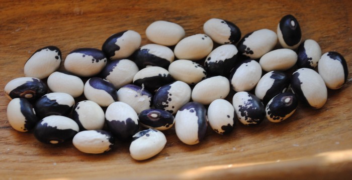 Blüht eher früh, weiße Blüten, rautenförmige Blätter, Reiserbohne, grüne Stängel. Pflanzenvitalität und Ernte eher durchschnittlich.