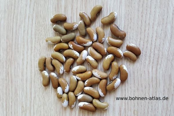 Sehr ertragreich. Pflanzenhöhe 50 cm, kräftiger Wuchs, weiße Blüten. 9 Hülsen pro Fruchtstand, 7 Körner pro Hülse. Hülsenlänge 18 cm, -breite 1 cm. Grüne Hülse mit gerader Form und rundem Querschnitt, ohne Fäden. Körner nierenförmig, mehrfarbig braun, mit weißem Fleck am äußeren, oberen Ende der Samenschale. Verwendiung als Grünbohne. Saatgut reift mittel bis spät, 80 % Keimmquote.