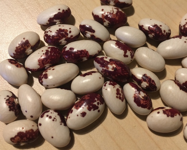 Herrlich weiß-weinrot gefärbte Sorte, deren ca. 15 x 8 mm großen Samen um den Nabel eine weinrote Figur in etwa einer fliegenden Taube zeigen.