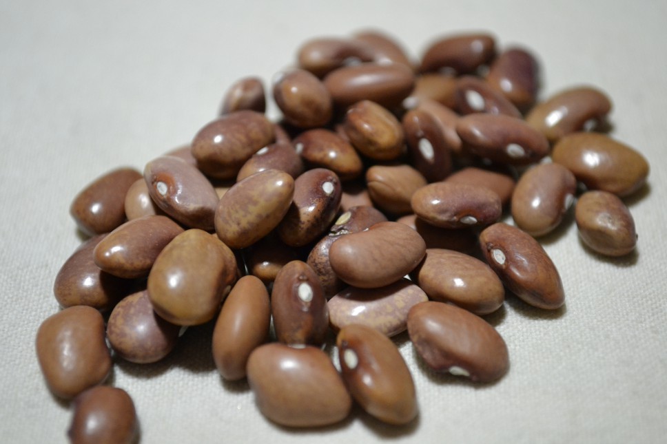 "Faded purple specks over cream-beige background. Pole bean from Central Mexico."