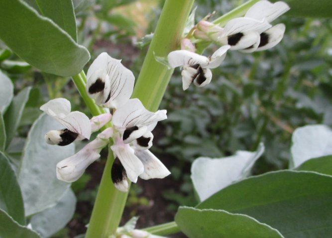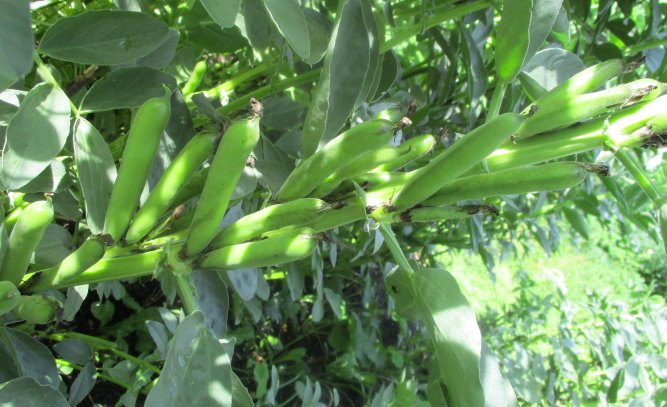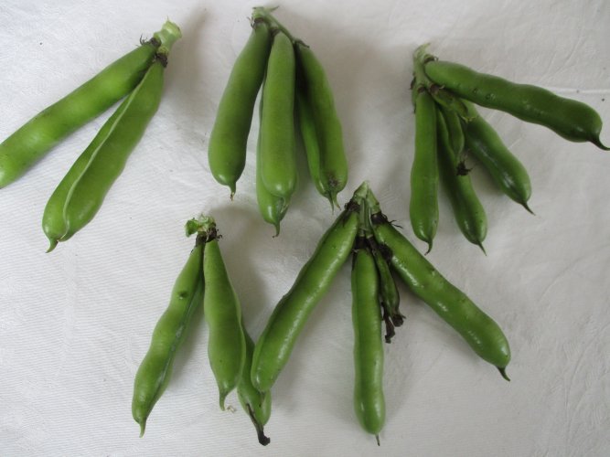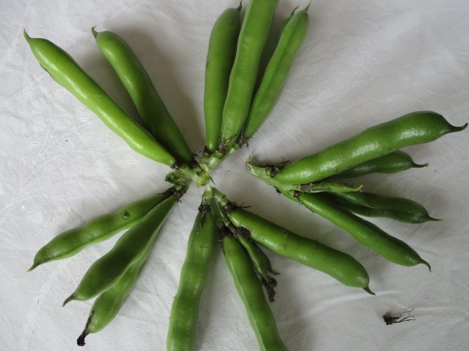 Die "Saubohne aus Libanon" hat eine Bohnenfreundin im türkischen Laden in Oldenburg gekauft und uns davon eine Portion Saatgut überlassen. In 2020 haben wir einen Grundbestand an Saatgut gewonnen, und daraus haben wir auf unserem Gemeinschaftsacker in diesem Jahr 2 Reihen für die Küche angebaut: Wir sind begeistert! Der Pflanztermin war Mitte Februar, und für die Küche hätten wir ab Ende Juni ernten können. Heute am 2.7.21 haben wir gepflückt, und viele 3triebige Fruchtstände, aber auch einige 5triebige gefunden. Überwiegend waren 4 Körner in einer Hülse.