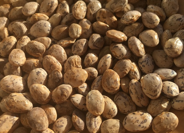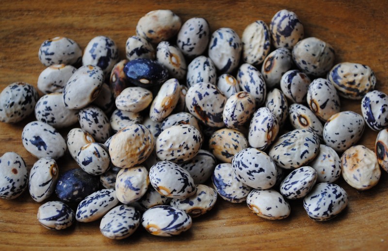 Ertragreiche Buschbohne slowenischer Herkunft, flache Hülsen, mittelgroßem beige-schwarz marmoriertem Korn.