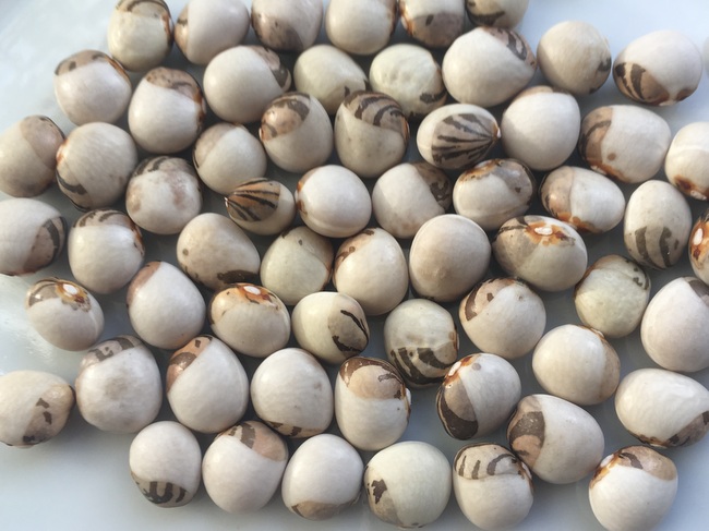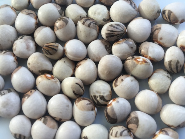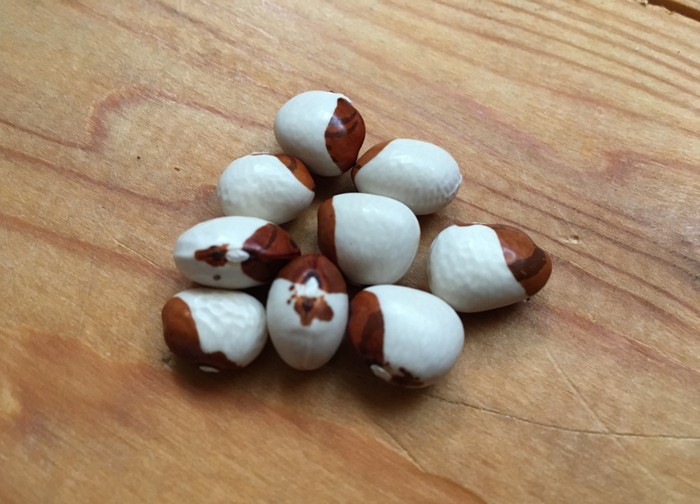 Fisolen fadenlos, bis ca. 15 cm lang, 5-selten7 kleine Kerne, auch wenn sich sich schon Kerne gebildet haben noch als Fisole verwertbar. Halb- und trockenreif geschmacklich beste Stangenbohne, leicht nussig, Samenhülle sehr zart. Korn weiß mit braungescheckter Zeichnung, Kinder lieben sie wegen ihrer variantenreichen Gesichterzeichnung. Ertragreich und eher frühreif. Wärmebedürftige türkische Landsorte. Nicht meher als 3 Kerne/Stange, vorziehen, nach Eisheiligen auspflanzen.