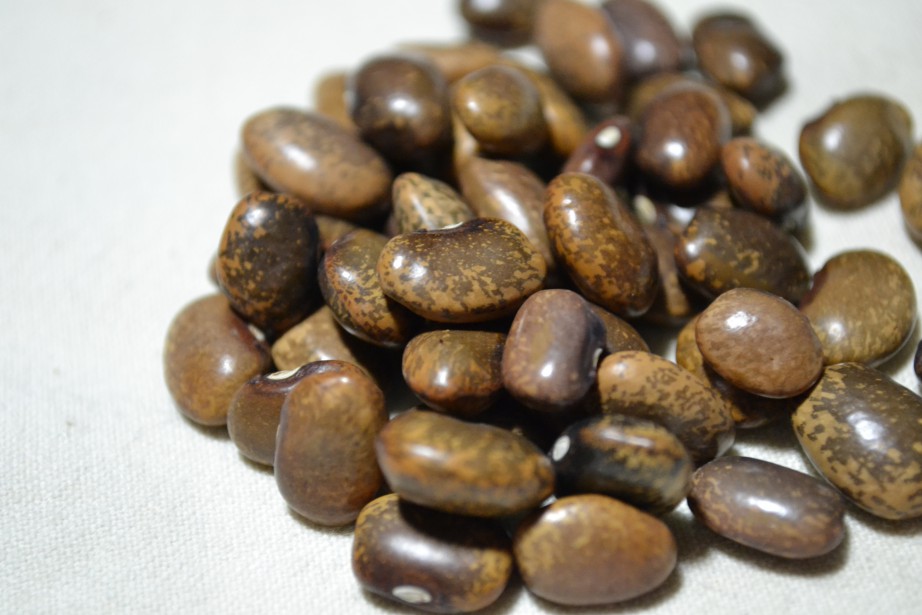 "Large beans with gray specks radiating over a cream-beige background. Originally collected in the Sierra Madre of western Tarahumara country. Pole bean."