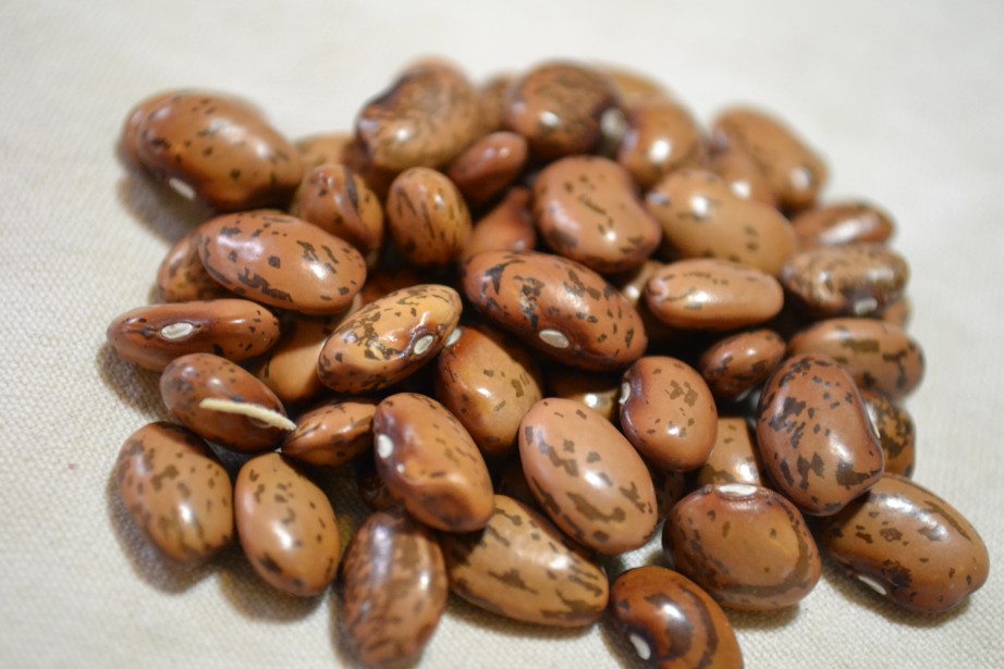 "Pinto bean with dark brown specks over a light beige background, from the Barranca del Cobre, Chihuahua. This pole bean is also called "Frijol Burrito.""