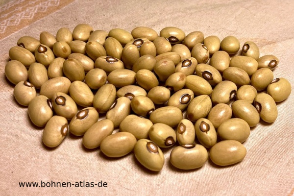 Buschbohne, Körnerbohne ; Buschbohne; Hülsen dunkelgrün, rund, fädig; Körner kugelig/oval, gelblich-beige, Nabelrand hellbraun; mittelfrüher, sehr guter Ertrag; Körnerbohne