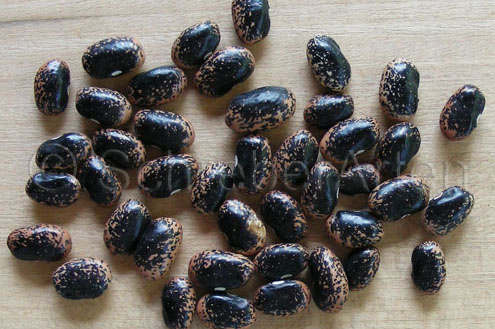 From Native Seeds/SEARCH: "Pole bean collected from the heart of the Sierra Tarahumara in Chihuahua. Black radiating outward from the seed "eye" across a white background. Late-maturing, good green beans, with dark lilac flowers."