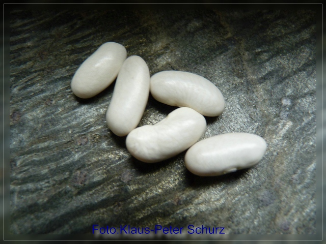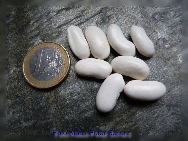 2,5 m hohe Stangenbohne mit weißen Blüten und grünen ca. 25 cm langen und 2 cm breiten, fadenlosen, runden Hülsen mit bis zu 10 Korn;