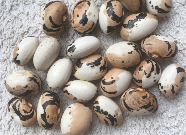 Blüht erst Ende Juli, vermutlich weiße Blüten. Rankt stark! Kerne 2-farbig (3-farbig?). Ende Juli noch keine Hülsen.