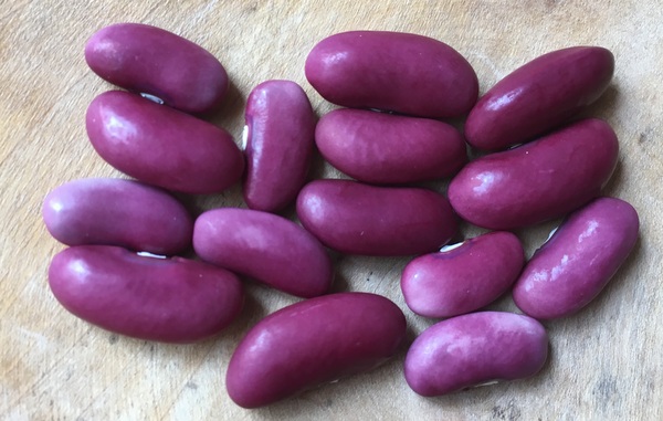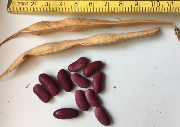 Buschbohne, wird um die 50 cm hoch, Fisolenernte ab Mitte Juli, ich habe aber die meisten Hülsen stehen lassen für die Körnerernte, ab Ende Juli entwickelten sich sichtbar die Körner. Aufgezogen zum Trocknen habe ich sie Ende August.