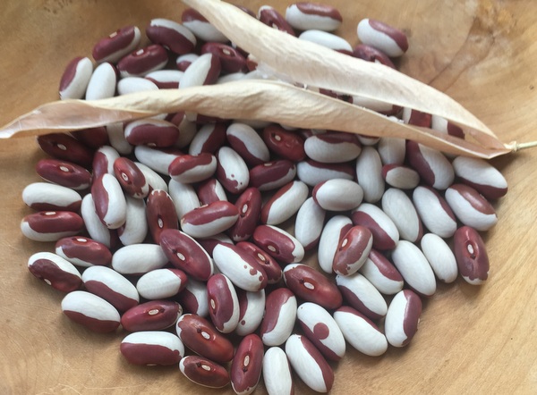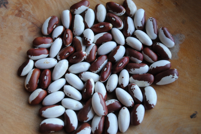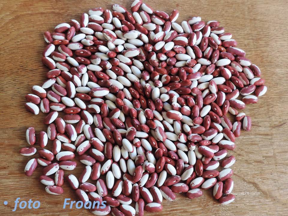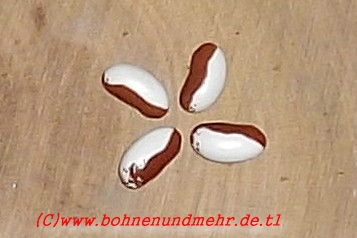 Diese schöne Sorte mit zweifarbigem Korn hat etzwa 18 x 8 mm große Samen. Vom Nabel her ist etwa 1/3 des Korns rotbraun gefärbt. Der überwiegende Teil der Fläche ist weiß. Nur ganz selten verirrt sich ein kleinerer oder größerer roter Punkt in die weiße Fläche. Die Bezeichnung "White" ist hier irreführend.
